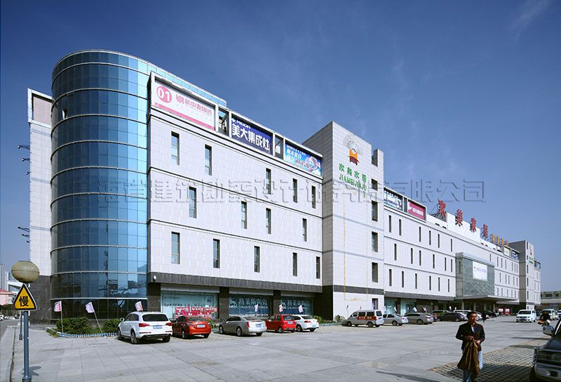 建筑體型為矩形,建筑立面窗采用亂碼窗的分割方式,石材幕墻錯縫排列,并采用表面不同質(zhì)感的石材加強實體墻的視覺效果,窗與實體墻比例劃分恰當(dāng),分格細膩,體塊規(guī)整大氣,端莊得體,體現(xiàn)大型賣場建筑的性格特征。