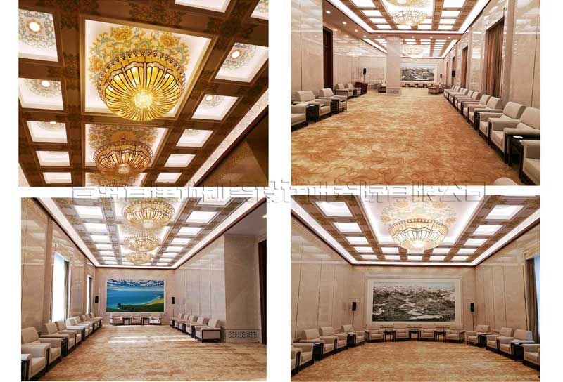 人民大會(huì)堂青海廳根據(jù)全國人民大會(huì)堂管理局安排重新調(diào)整位置,需要重新裝修改造。新青海廳位于人民大會(huì)堂Ⅱ段三層?xùn)|南角,北側(cè)與人民大會(huì)堂金色大廳和三層小禮堂相對(duì),南側(cè)面向人大辦公樓內(nèi)院。位置與金色大廳和小禮堂位置靠近,原功能為領(lǐng)導(dǎo)人休息廳。青海廳總建筑面積350平方米,會(huì)議廳平面尺寸為29.3米×8.0米狹長的空間,建筑內(nèi)表面積為222.68平方米,廳內(nèi)原設(shè)計(jì)設(shè)變形縫,中間約2/5處設(shè)框架柱,吊頂高度5.0米左右,周邊設(shè)有服務(wù)間、衛(wèi)生間、配電間等服務(wù)設(shè)施。原裝修為2000年裝修改造工程。廳室尺寸為一狹長空間,長寬比達(dá)到1:3.67,空間比例很不協(xié)調(diào),為改造裝修工程帶來較大的難度,也是改造工程的重點(diǎn)。