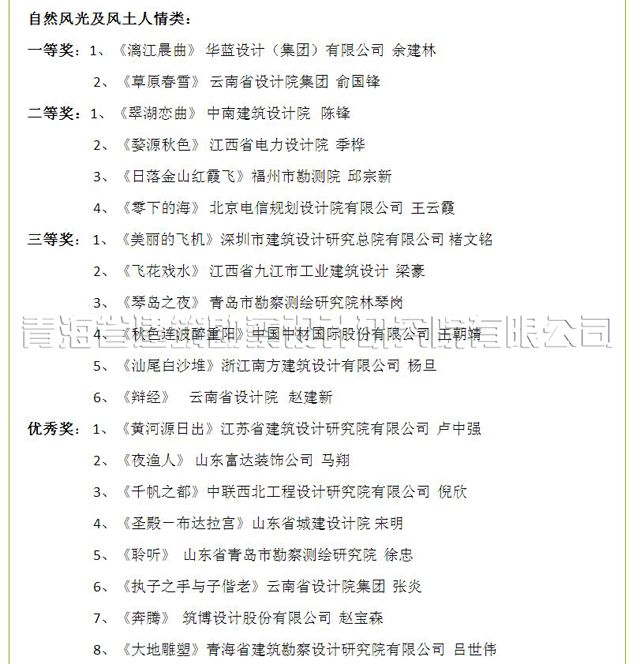 近期,根據(jù)中國(guó)勘察設(shè)計(jì)協(xié)會(huì)《關(guān)于公布首屆全國(guó)勘察設(shè)計(jì)行業(yè)攝影大賽獲獎(jiǎng)名單的通知》(中設(shè)協(xié)字[2015] 52號(hào)),我院生產(chǎn)經(jīng)營(yíng)部主任呂世偉同志提交的參賽作品《大地雕塑》獲自然風(fēng)光及風(fēng)土人情類優(yōu)秀作品獎(jiǎng),這是我院自建院以來(lái),在全國(guó)舉辦的有影響的攝影比賽中實(shí)現(xiàn)的又一新突破,特向獲獎(jiǎng)?wù)弑硎咀YR!